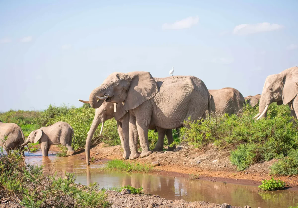 Your 6-Day Kenya Bush Safari begins with a morning departure from Nairobi, driving south toward Amboseli National Park. The scenic journey offers glimpses of rural Kenya before the dramatic backdrop of Mount Kilimanjaro comes into view. Arrive in time for lunch at Hunters Luxury Manor Amboseli, your comfortable base for the next two nights. After settling in, head out for your first afternoon game drive across Amboseli’s vast plains. The park is famous for its large elephant herds, often seen walking beneath Africa’s highest peak. You may also encounter giraffes, zebras, buffalo, and predators such as lions. Return to the lodge for dinner and overnight.